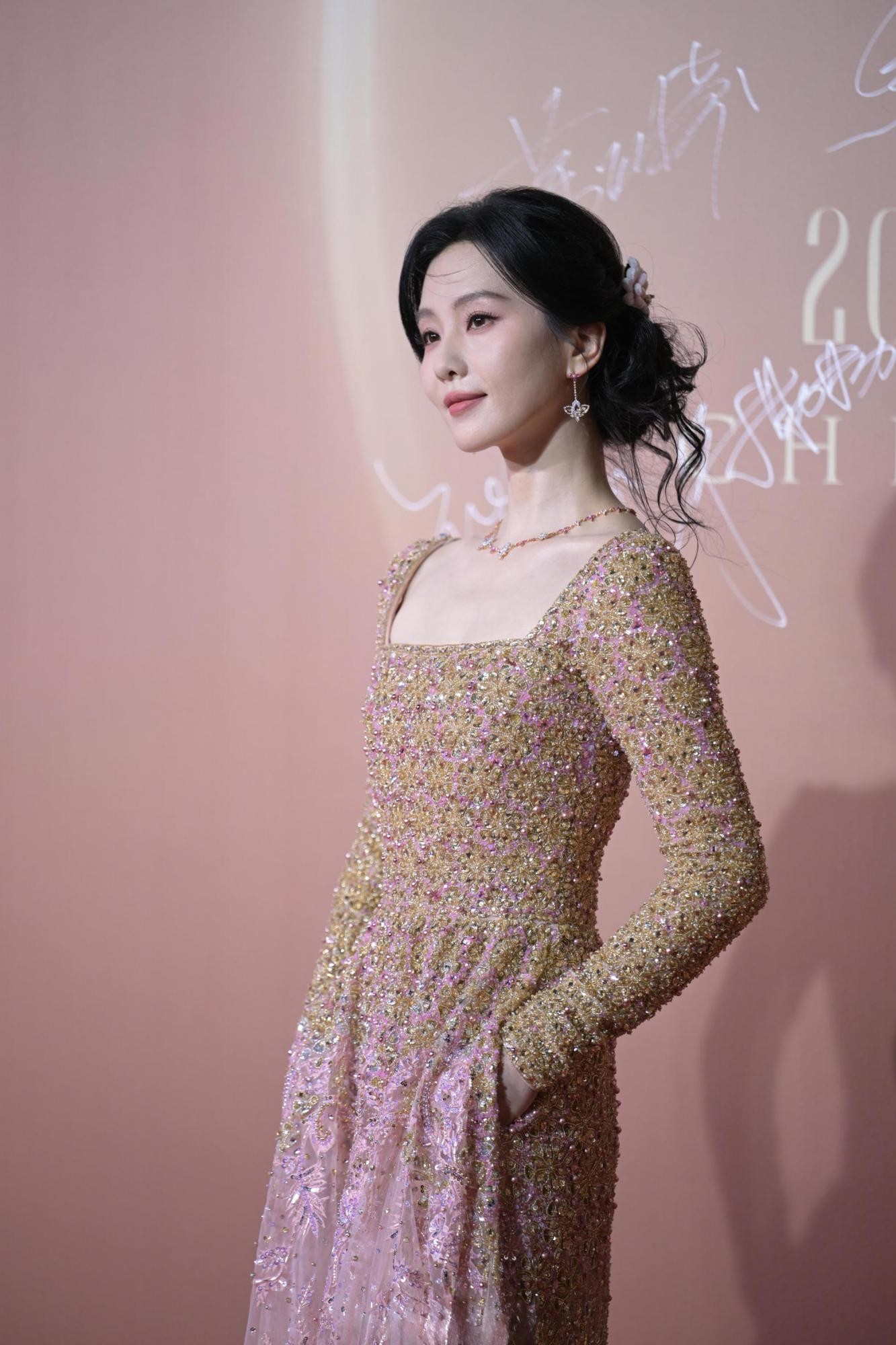 值得一提的是,这组照片的魅力很大程度上源于其“生图”属性。没有影棚里完美的灯光布景,也没有后期过度的肌肤磨皮,图片中皮肤的质感、礼服面料的光泽乃至现场的光影都显得无比真实。这种真实感非但没有折损她的美丽,反而让那份优雅变得更加可触可感。脸颊旁自然散落的几缕发丝,为整体端庄的造型注入了一丝随性与温柔,让人联想到她此前穿裸粉色礼裙时那种“大家闺秀温婉动人”的神韵。